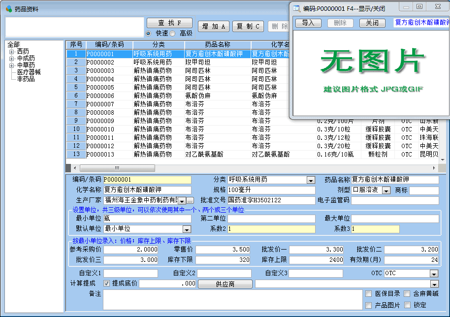 海思藥品進銷存管理軟件GSP(銷售管理軟件)藥品資料